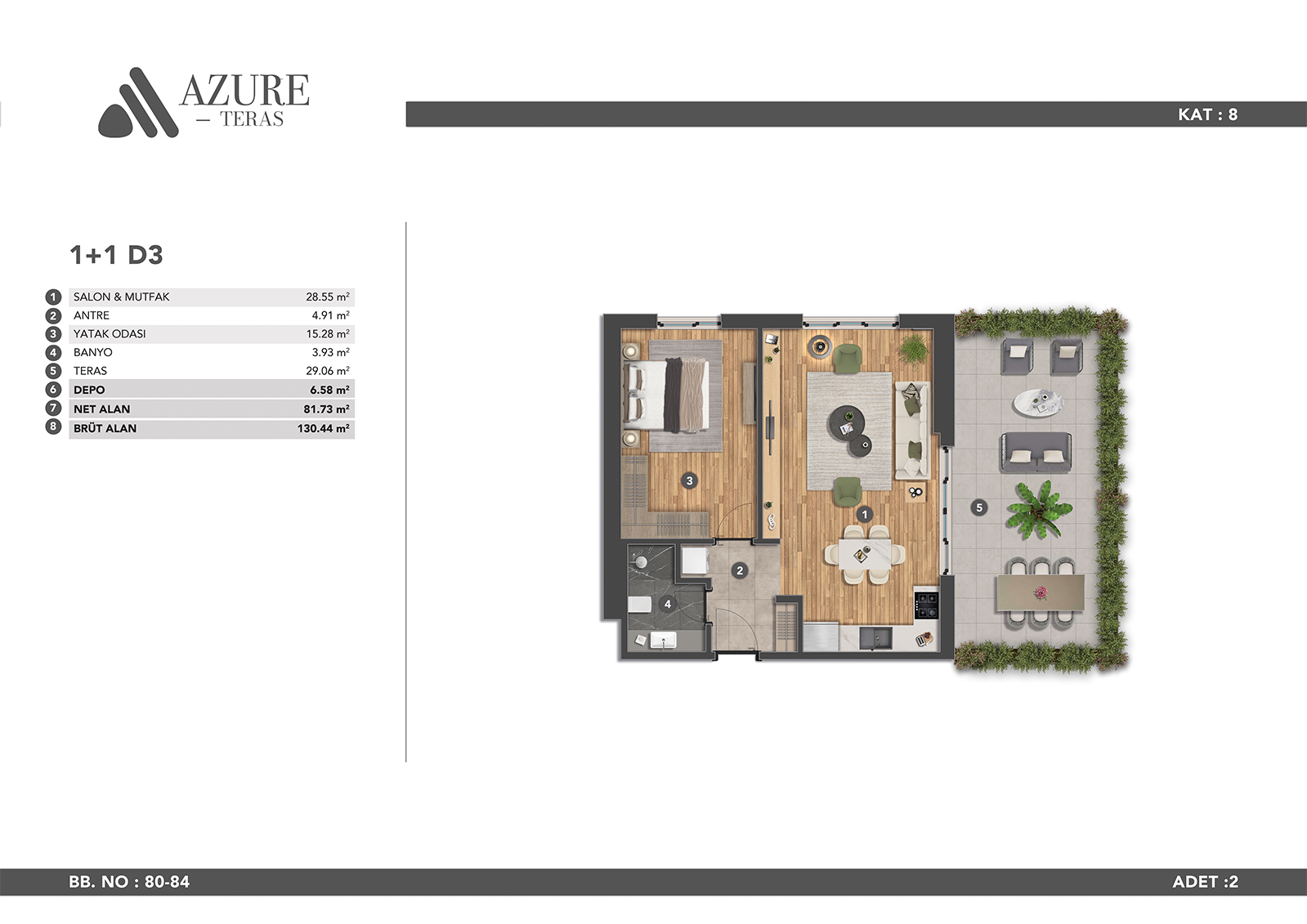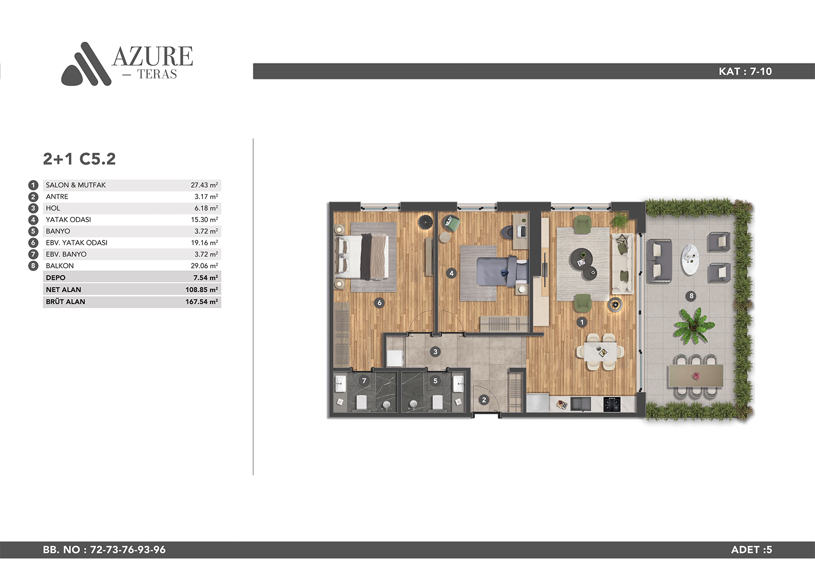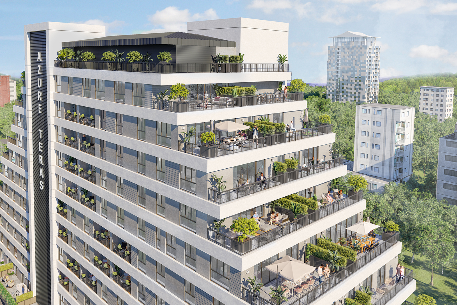 Azure Teras is designed to make you feel comfortable in modern city life with its large living spaces. A life away from the stress of the city awaits you in our apartments, which offer spaciousness and comfort in all areas.