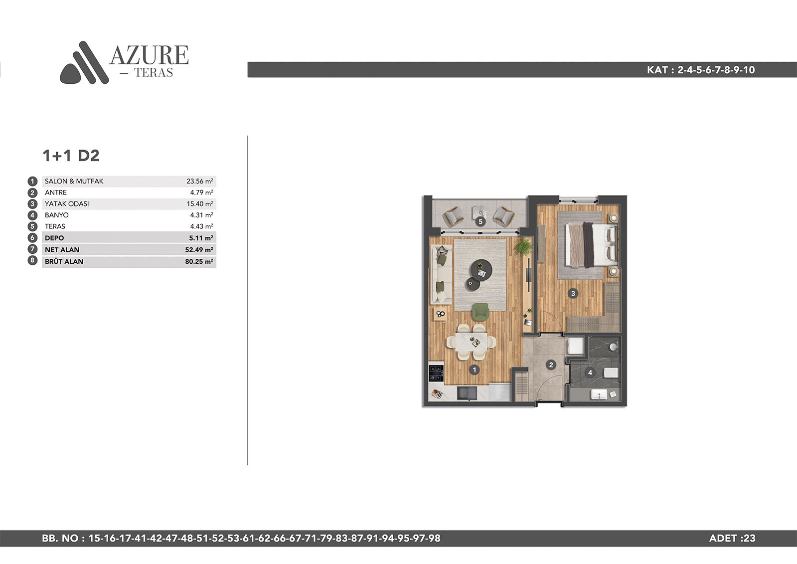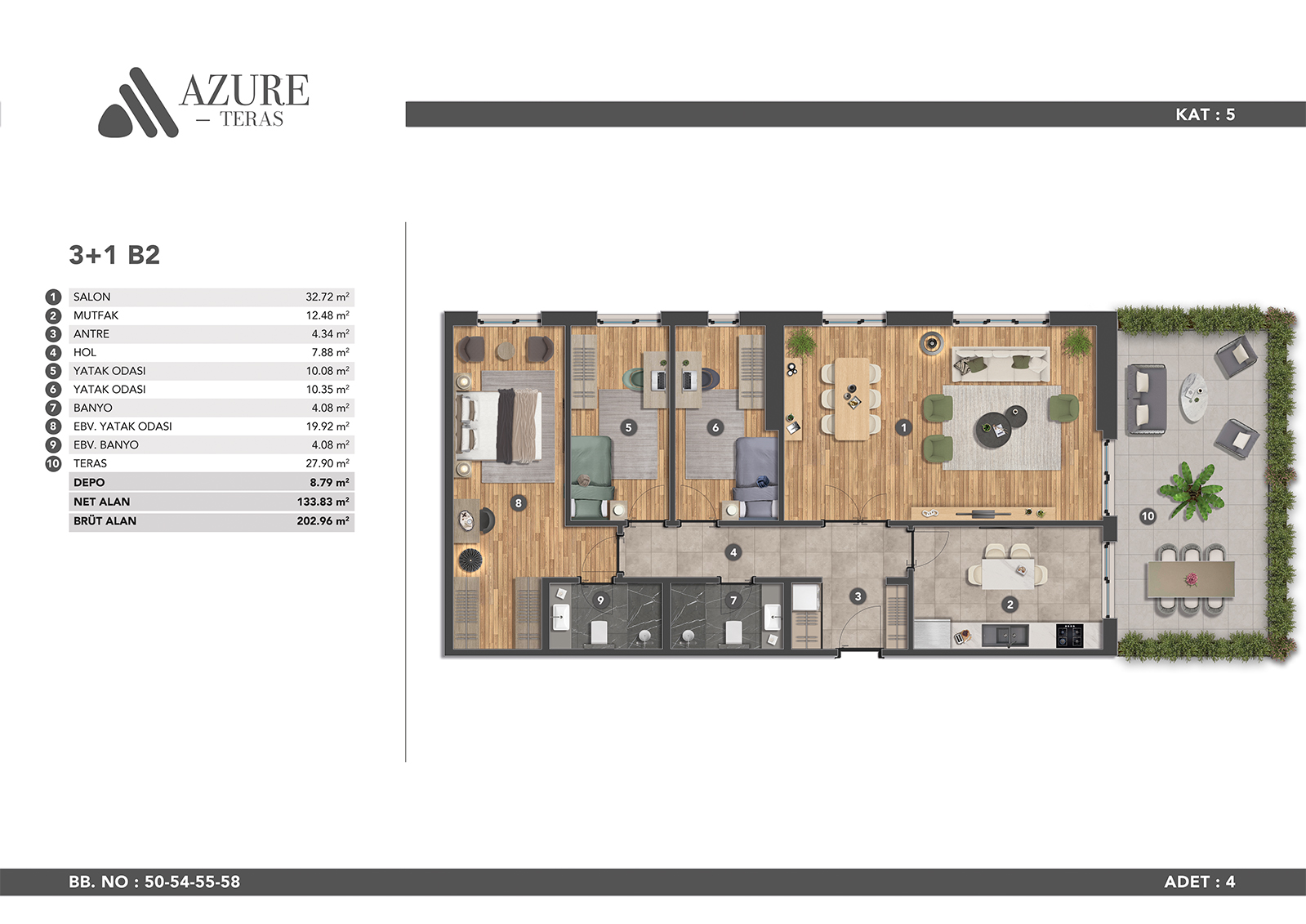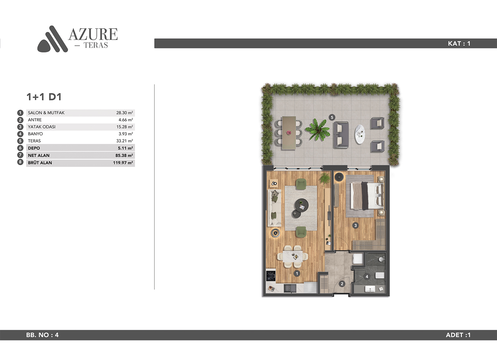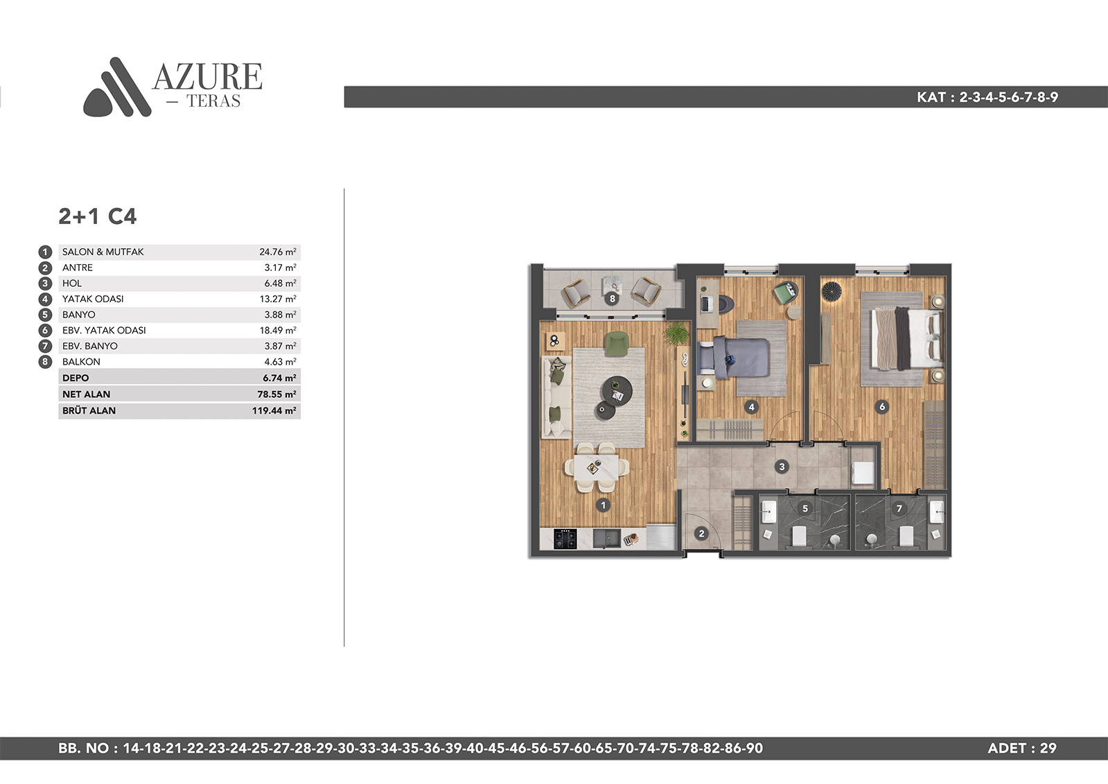 Azure Teras is designed to make you feel comfortable in modern city life with its large living spaces. A life away from the stress of the city awaits you in our apartments, which offer spaciousness and comfort in all areas.