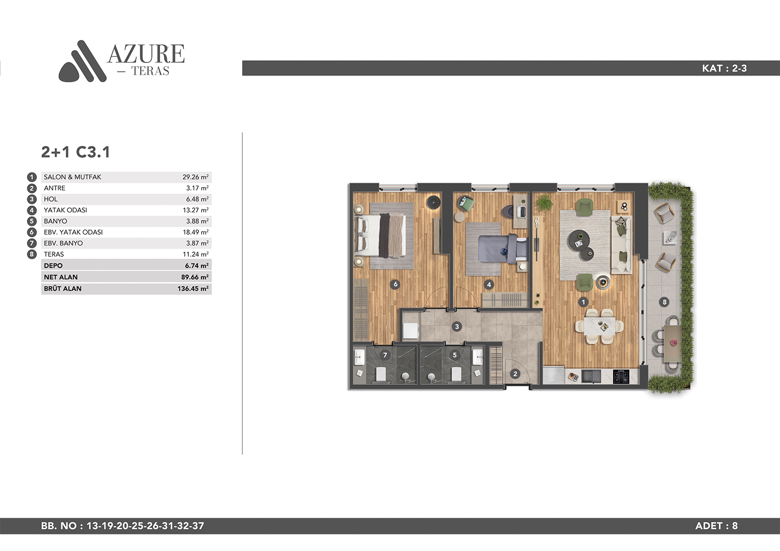 Azure Teras appeals to every style with different flat options from 1+1 to 3+1. The project offers many opportunities for both large families and newlywed couples, as well as those who purchase houses for investment purposes.